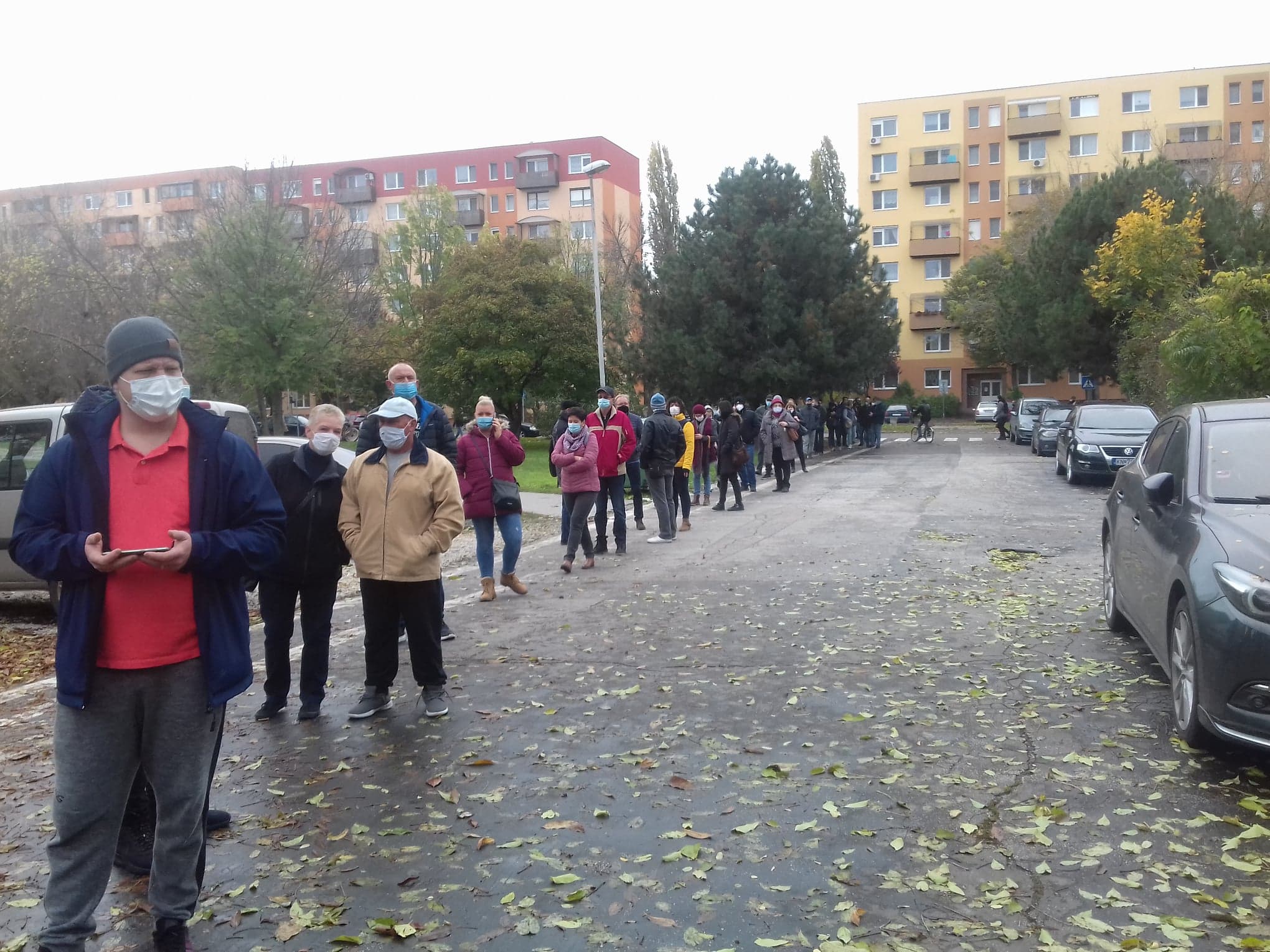 Az Eötvös Utcai Alapiskola épületénél nagy az érdeklődés a tesztelés iránt. Reggel óta folyamatosan hosszú sor kígyózik, amely az utcai gyalogjárón ér véget. Ettől azonban nem szükséges megijedni, mert nagyon gyorsan halad előre a menet, ugyanis egyszerre három teremben végzik a tesztelést. Összesen 30 percet várakoztam a bejutásig. Még az épület előtt kapunk egy papír-zsebkendőt, és kifújjuk az orrunkat, utána következik a kézfertőtlenítés. Az épületben egy adminisztratív dolgozónak bemutatjuk a személyigazolványunkat és kapunk egy sorszámot.