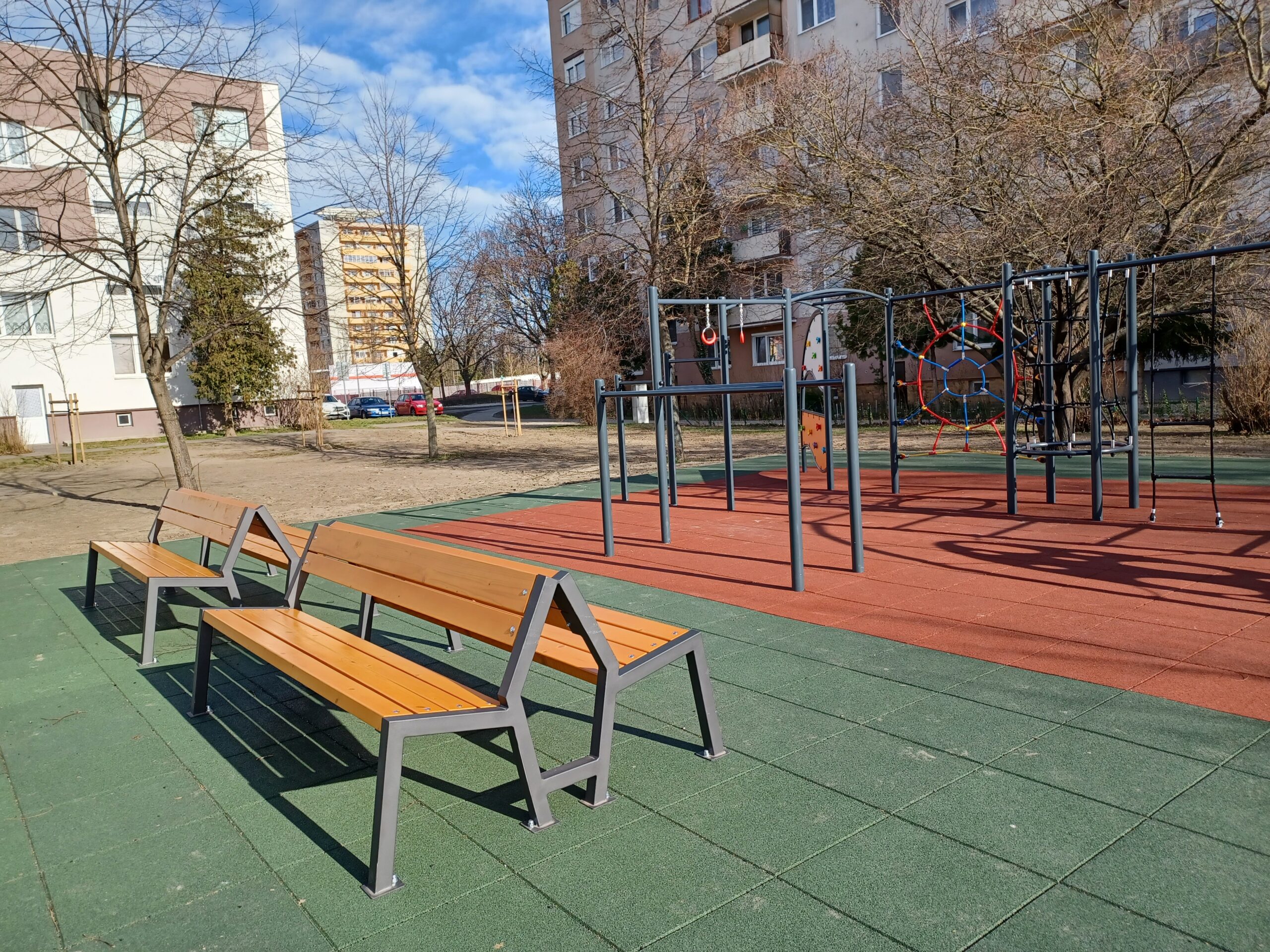 A kisgyermekek számára kialakított játszótér mozgásfejlesztő játékelemei mellett egy új kosárlabdapálya is található, előtte pedig kültéri fitness gépek kaptak helyet.