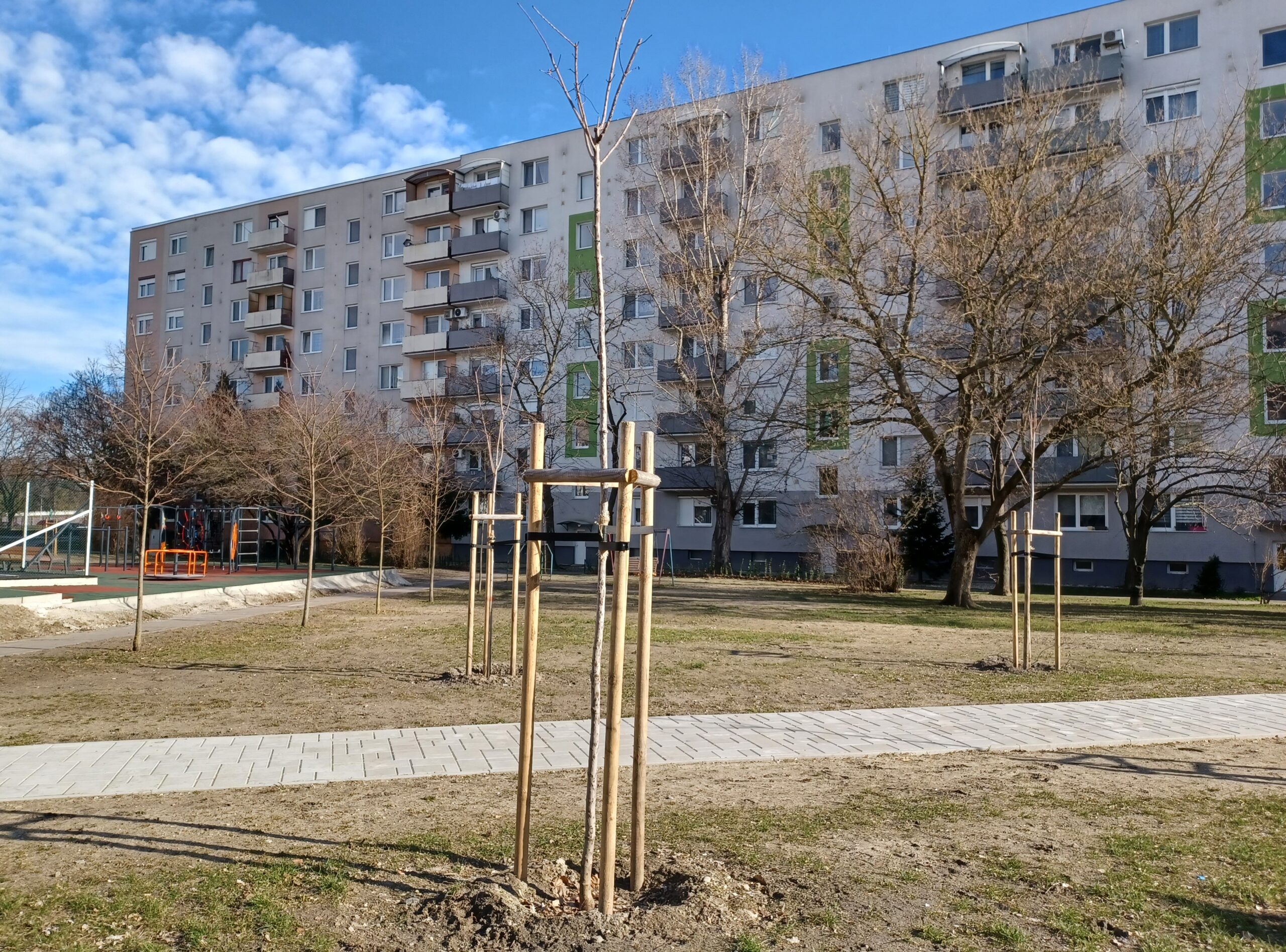 A tömbházak által közrefogott területen megújult a zöldövezet is, számos facsemete került kiültetésre, amelyek egy-két év múlva majd nagyon kellemessé teszik a környezetet. A facsemeték a város saját faiskolájából származnak. A lakóházak között kiépítettek egy teljesen új járdaszakaszt is, amely átlósan szeli át a füvesített területet, mely tavaszra kezd majd zöldelleni.