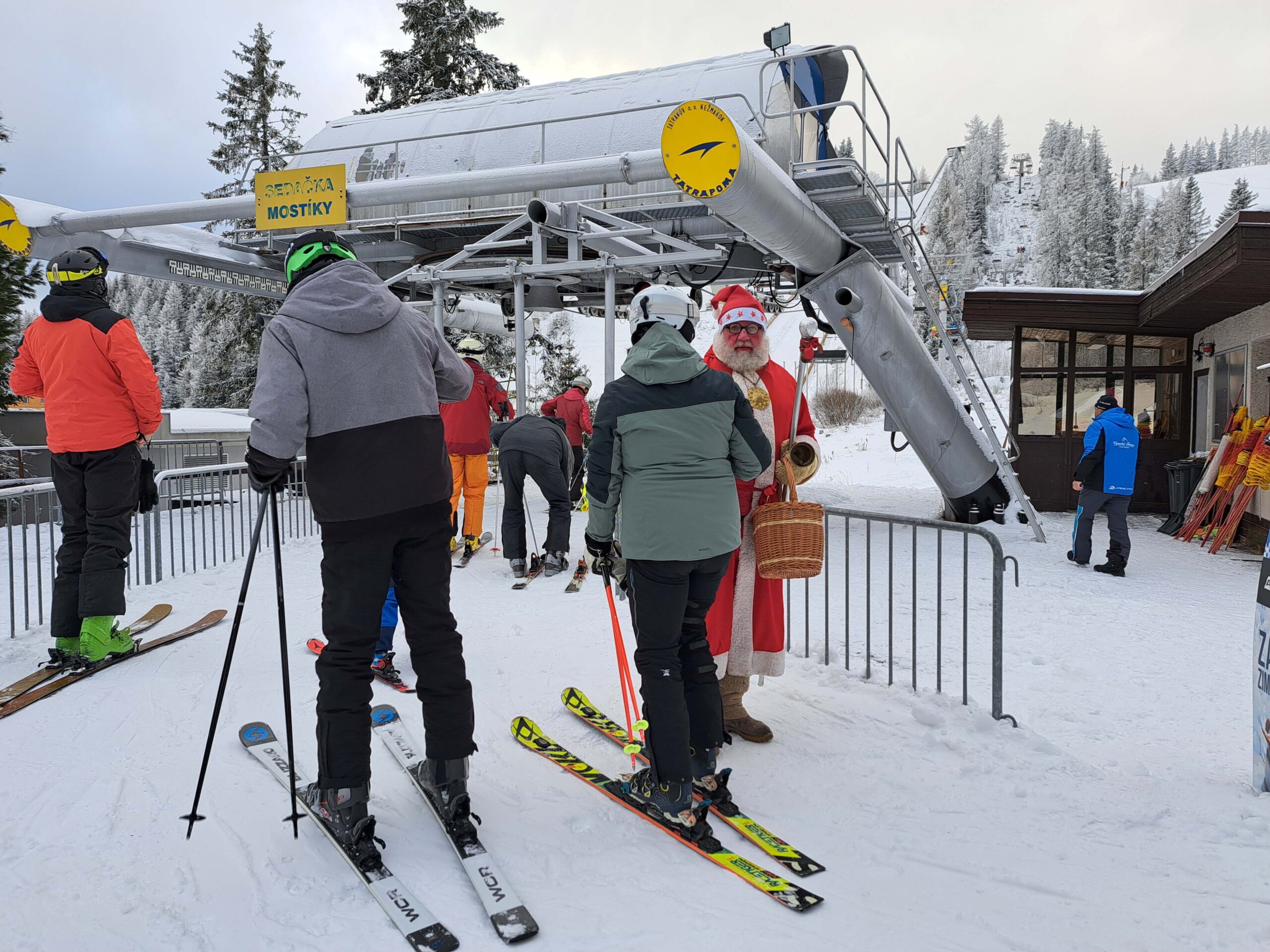 Lyžiari pri lanovke počas spustenia prvej lyžovačky vo Vysokých Tatrách v lyžiarskej sezóne 2024/2025 v stredisku Štrbské Pleso, ktorú symbolicky otvoril Mikuláš. Štrbské Pleso, 6. december 2024. Foto: SITA/Mária Frisová