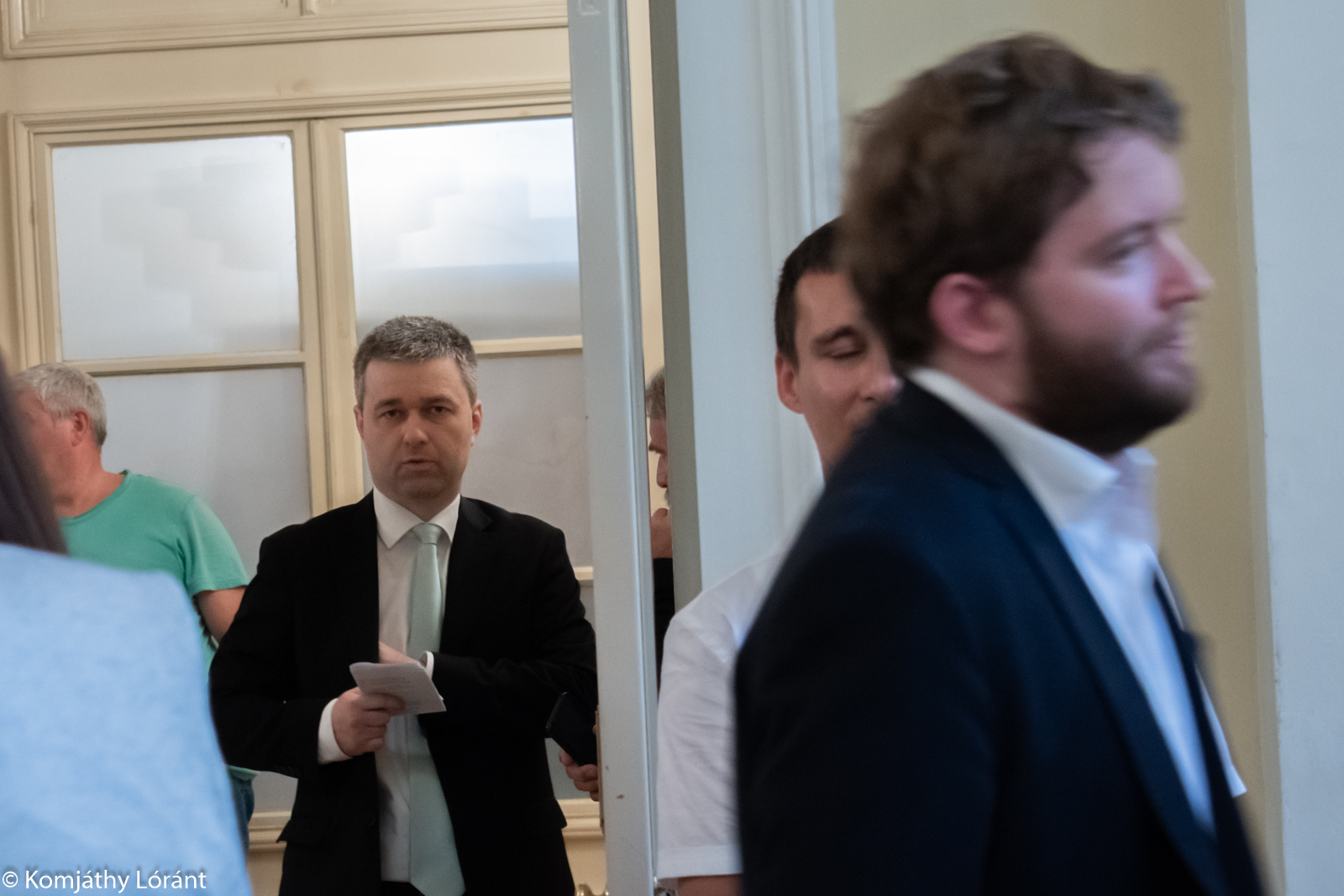 Králik Róbert MKP-s sajtótitkár érkezik a hátsó szobából. Megnyugtat minket a levegőtlen, bezárt ablakú nagyteremben pácolódókat, hogy mindjárt kezdünk. Fotó: Körkép.sk/Komjáthy Lóránt