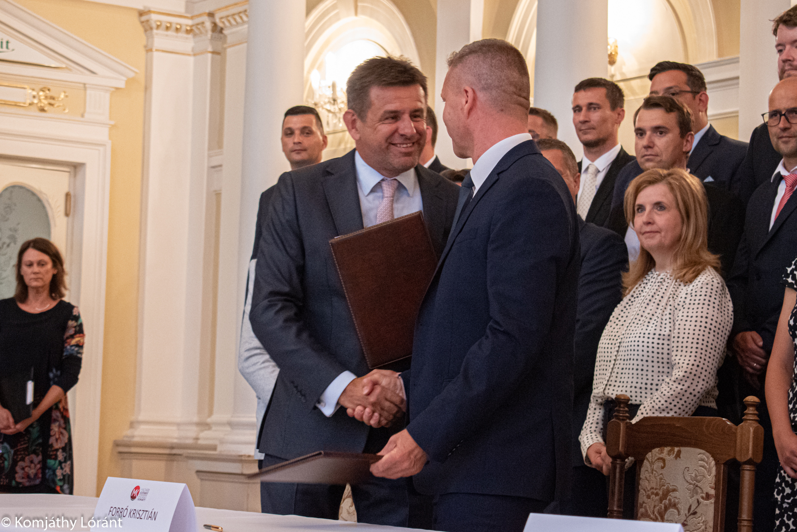 Rigó Konrád (Most-Híd) (b) és Orosz Örs (Összefogás/MKÖ) (j) üdvözli egymást meleg kézfogással és széles vigyorral. Fotó: Körkép.sk/Komjáthy Lóránt