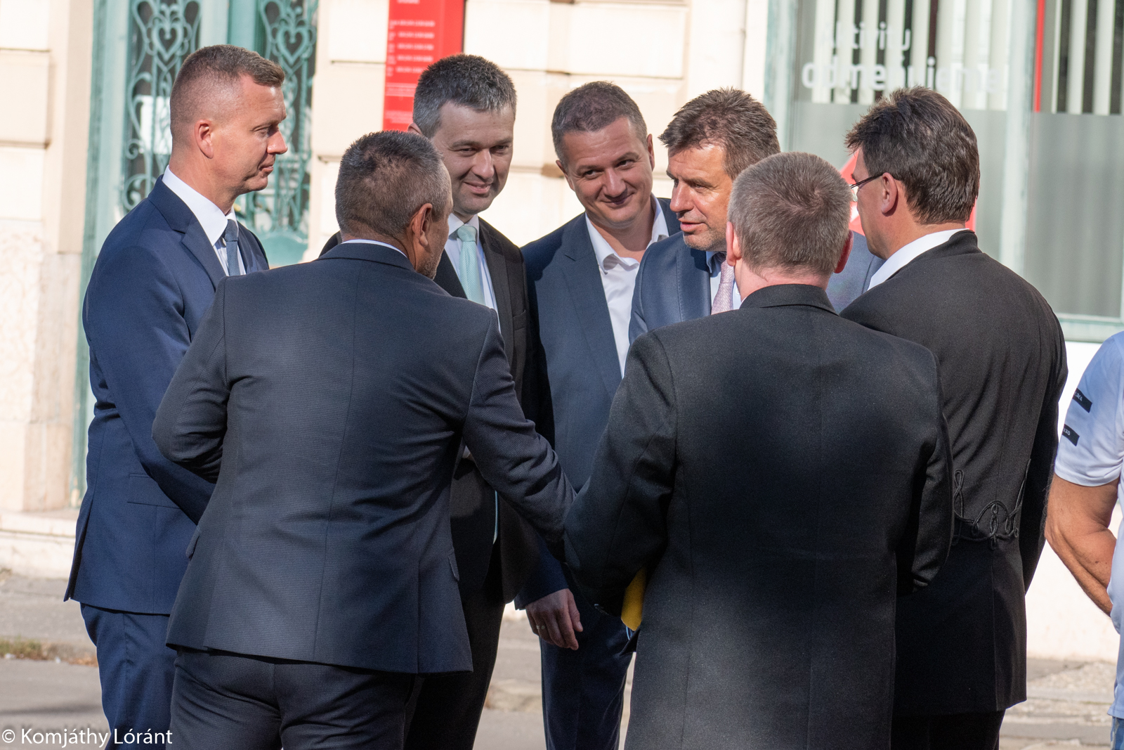Potápi Árpád János nemzetpolitikai államtitkár érkezik a Tiszti Pavilon épületéhez. Bárdos Gyula, a Csemadok elnöke és Orosz Örs (Összefogás) fogadja. Fotó: Körkép.sk/Komjáthy Lóránt