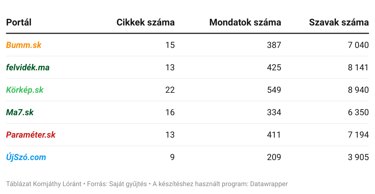 A liberális hangvételű portáloknak tekintett ÚjSzó.com, Paraméter.sk, Bumm.sk, valamint a konzervatív beállítottságú Körkép.sk, Ma7.sk, és Felvidék.ma írott cikkeit nyálaztuk át (a stúdióbeszélgetésekkel, podcastokkal nem foglalkoztunk). A munka virtuális részéhez a Python programozási nyelvet használtunk.