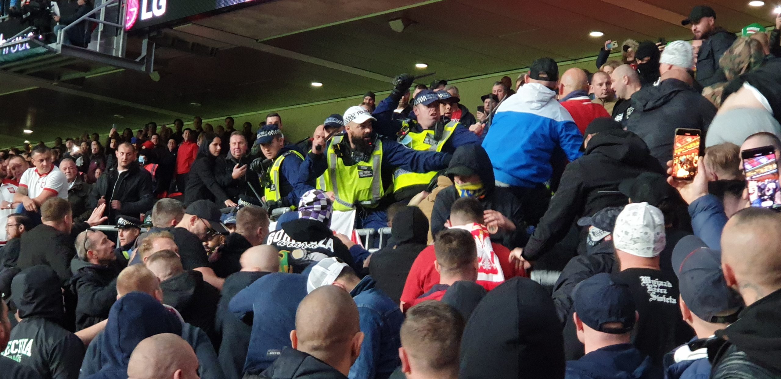 A balhé a mérkőzés 3. percében tört ki, amikor a biztonságiak megpróbáltak kivinni egy lengyel szurkolót a szektorból. Mint utólag kiderült, megvádolták őt azzal, hogy állítólag rasszista megjegyzést tett az egyik fekete szervezőre, aki kihívta rájuk a rendőröket.
