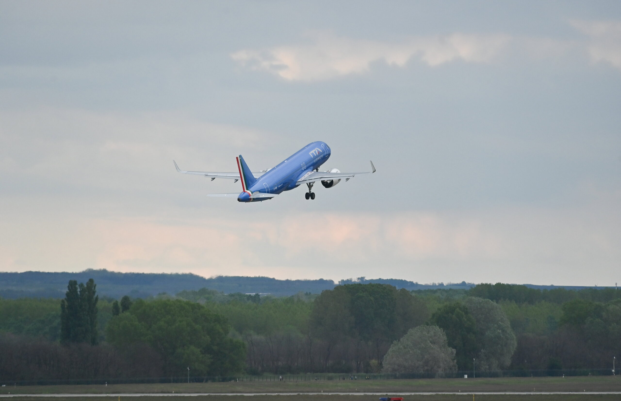 Ferenc pápa repülõgépe távozik a Liszt Ferenc-repülõtérrõl 2023. április 30-án. Az egyházfõ háromnapos apostoli látogatáson tartózkodott Magyarországon.