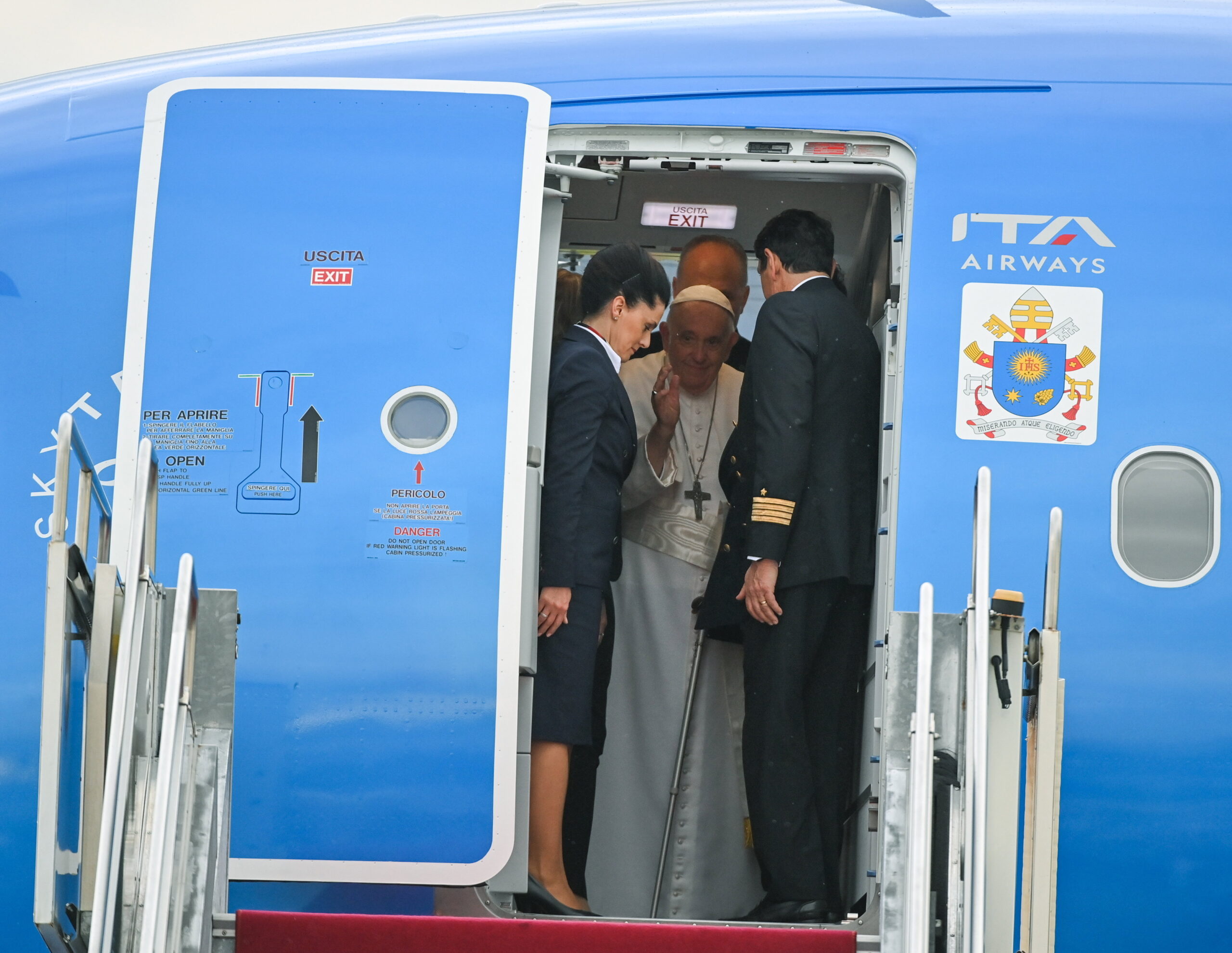 Ferenc pápa távozik Budapestrõl a Liszt Ferenc-repülõtéren 2023. április 30-án. Az egyházfõ háromnapos apostoli látogatáson tartózkodott Magyarországon.