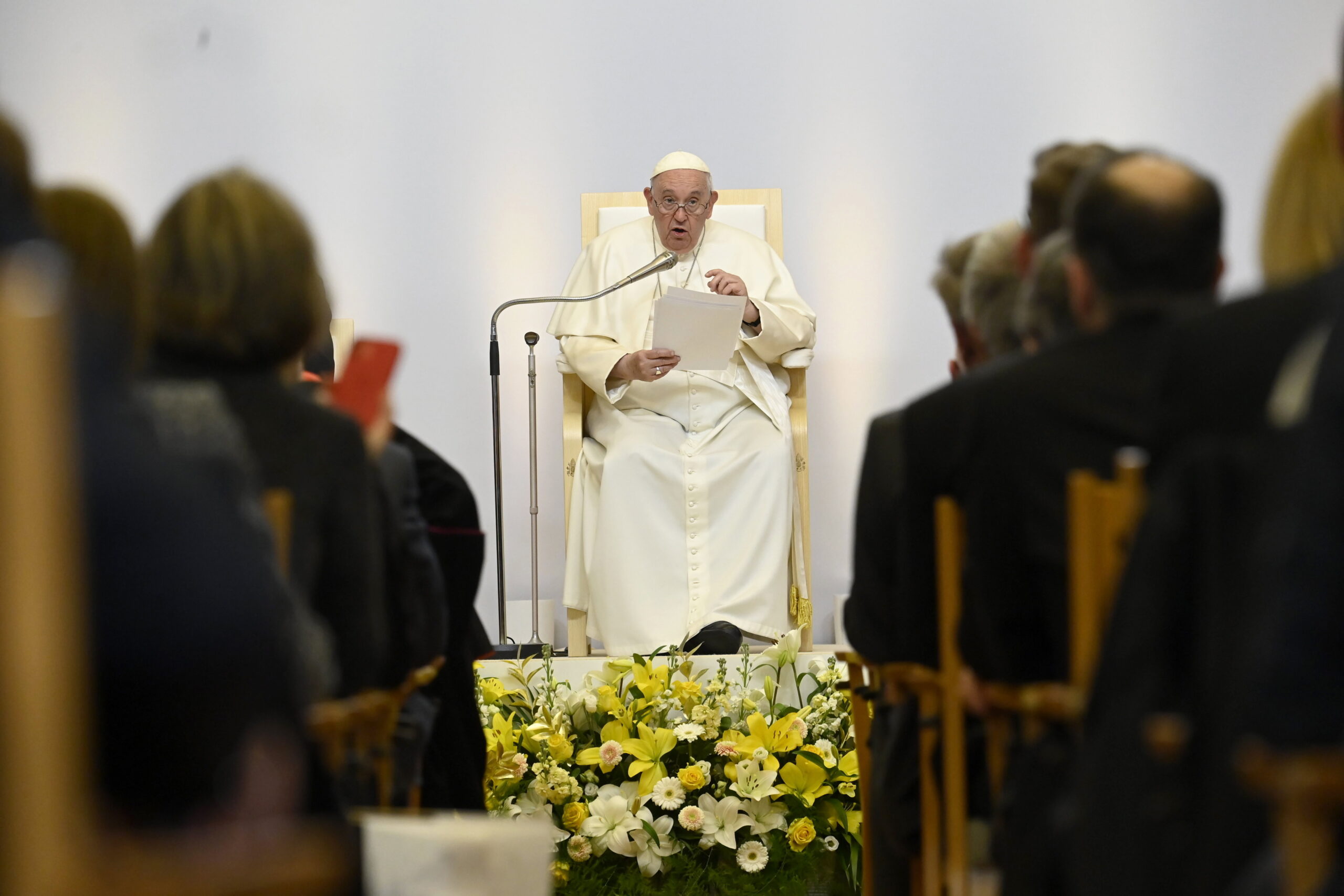 Ferenc pápa beszédet mond a Pázmány Péter Katolikus Egyetem információs technológiai és bionikai karán 2023. április 30-án. Az egyházfõ háromnapos magyarországi apostoli látogatásának utolsó programján az egyetemi és kulturális élet képviselõivel találkozik.