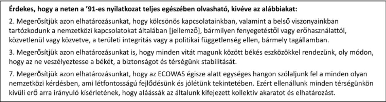 - Ismételten megerősítjük a meg nem támadásról szóló jegyzőkönyv 1978. április 22-i rendelkezéseit és elkötelezettségünket a béke és a stabilitás fenntartása mellett az ECOWAS régióban…