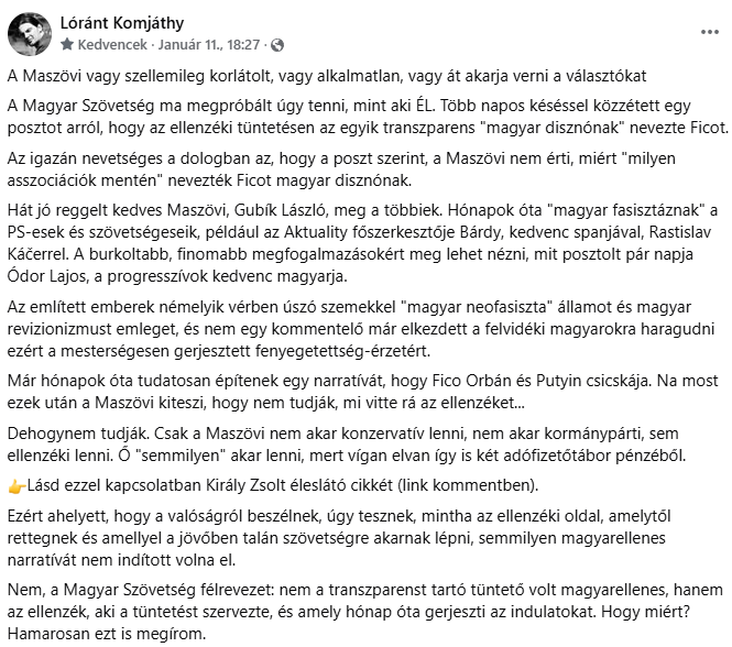 Egy nappal később rájöttek, hogy a kormányellenes tüntetők bizony magyar disznónak nevezték Robert Ficót. Igaz, Gubík László is csak azután értette meg, hogy ez mégis “milyen asszociációk mentén” történt, hogy arról Komjáthy Lóránt írt egy kis magyarázatot. Mondhatnánk, jobb későn, mint soha!