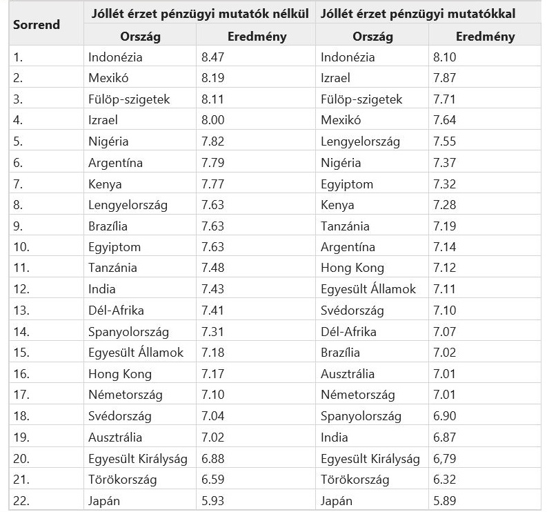 Világos, hogy az anyagi feltételek figyelembevétele alig változtat a rangsoron. Ha azonban igen, legyen svéd, vagy indiai, valós (abszolút) helyzetétől függetlenül mindenki szegényebbnek érzi magát a kelleténél.